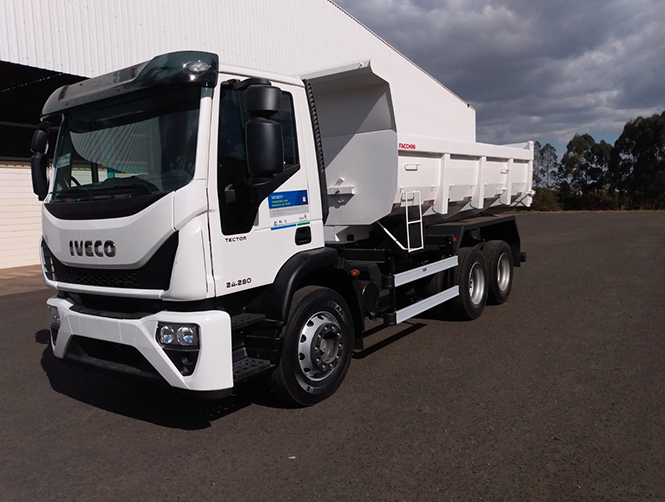 Caçambas basculantes com capacidade de 5m³ a 16m³.São confeccionadas em chapas de aço de altíssima resistência, com sistema de abertura da tampa traseira tipo “porteira”, que permite o transporte de máquinas e veículos, além do basculamento tradicional.
