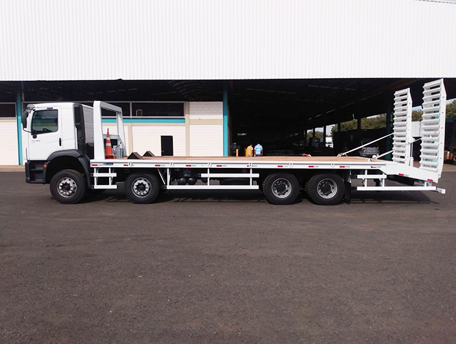 Rampas traseiras: com acionamento hidráulico e cantoneiras de aço para melhor rodagem dos equipamentos.